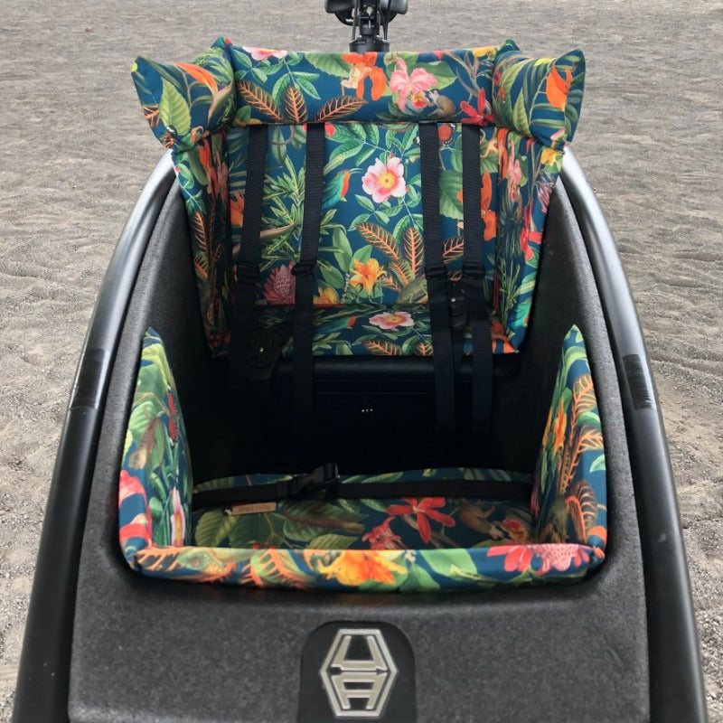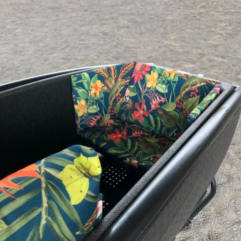 This Studio Vollebak cargo bike pillow has been specially developed for the second bench in the Urban Arrow Family. This pillow takes care of extra comfort for your child(ren) in the cargo bike. The pillow is handmade in the Netherlands and available in different colours. It is easy to assemble in the box and is secured with Velcro under the bench. The original strap of the bench can be used through the hole in the pillow. The fabric used is durable and water resistant . This cargo bike cushion is only suitable for the second seat of the Urban Arrow Family cargo bike.